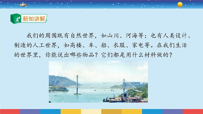 展开我们的周围既有自然世界,如山川、河海等;也有人类设计、制造的人工世界,如高楼、车、船、衣服、家电等。在我们生活的世界里,你能说出哪些物品?它们都是用什么材料做的?
