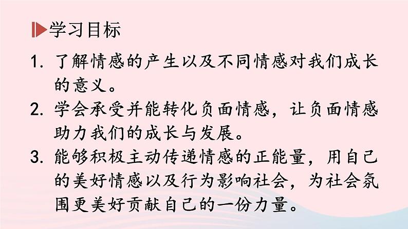 了解情感的产生以及不同情感对我们成长的意义。学会承受并能转化负面情感,让负面情感助力我们的成长与发展。能够积极主动传递情感的正能量,用自己的美好情感以及行为影响社会,为社会氛围更美好贡献自己的一份力量。