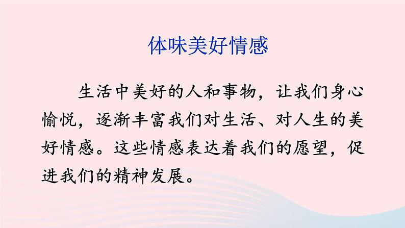 生活中美好的人和事物,让我们身心愉悦,逐渐丰富我们对生活、对人生的美好情感。这些情感表达着我们的愿望,促进我们的精神发展。