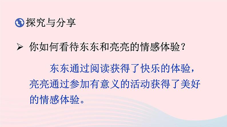 东东通过阅读获得了快乐的体验,亮亮通过参加有意义的活动获得了美好的情感体验。