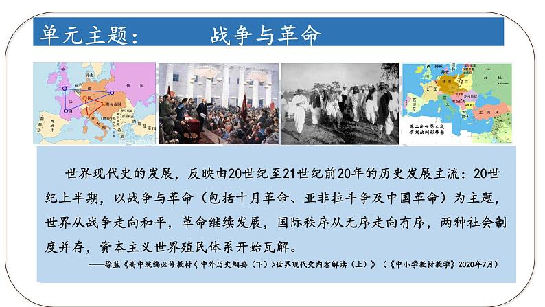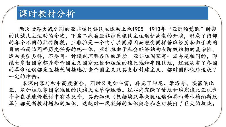 这是一份人教统编版第七单元 两次世界大战、十月革命与国际秩序的演变第16课 亚非拉民族民主运动的高涨教课ppt课件,共39页。PPT课件主要包含了单元课程标准,单元结构梳理,课时教材分析,学生学情分析,课时目标,教学重点难点,教法学法,教学主题,教学过程,宏观分析等内容,欢迎下载使用。