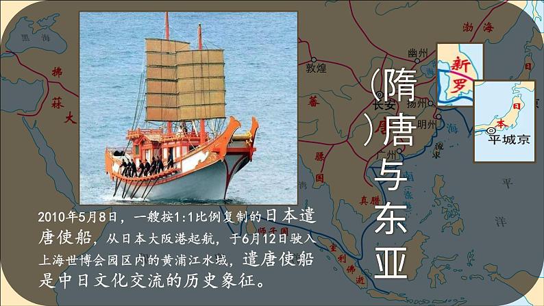 过渡:这幅图是2010年5月8日,一艘按1:1比例复制的日本遣唐使船,从日本大阪港起航,于6月12日驶入上海世博会园区内的黄浦江水域,遣唐使船是中日文化交流的历史象征。下面我们就一起走进隋唐与东亚日本的交往。